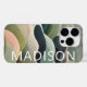 Abstrait moderne Wavy Motif Personnalisé Nom iPhone 14 Pro Phone Boîtes dispose d'un motif ondulé abstrait en gris, vert et rose avec votre nom personnalisé dans la typographie de script moderne blanc. Parfait pour des cadeaux de Noël personnalisés et des vacances d'hiver. Conçu par © Evco Studio www.zazzle.com/store/evcostudio