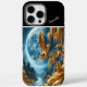 Un aigle perché sur une branche d'arbre doré regarde une pleine lune au-dessus d'un océan chatoyant. Un paysage fantastique se déroule sous l'orbe brillante.
