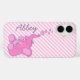 Un joli éléphant soufflant des bulles en forme de coeur sur un motif de bande rose bonbon. Coque iphone fille mignonne, personnalisez avec votre nom. Voici l'exemple : Abbaye. Uniquement conçu et illustré par Sarah Trett. www.sarahtrett.com