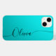 Aqua Shimmer Black Elegant Calligraphy Script Personnalisé Nom iPhone 14 Smart Phone Boîtes dispose d'un design moderne et tendance simple et élégant avec votre nom personnalisé dans élégante écriture calligraphie script typographie sur un aqua métallique shimmer arrière - plan. Conçu par ©Evco Studio www.zazzle.com/store/evcostudio