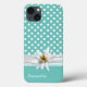 Coque iphone chic, avec un aqua et un motif à pois blanc, de l'autre côté du haut et un aqua solide au fond, du coque. Graphiques d'un ruban blanc et dentelle blanche, coule entre les deux arrière - plans et est décoré d'une fleur Edelweiss blanche et jaune. Personnalisez le texte personnalisé en fonction de vos besoins.