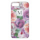 Roses d'aquarelle et monogramme Coque-Mate floral à peine Il iPhone 8/7 Coque. Il présente un motif de roses vintages en violet et corail et votre monogramme dans un cadre blanc.