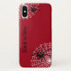 Coque iphone à thème Black Widow, réalisé en rouge, avec des images de toiles blanches et d'araignées noires. Personnalisez le texte noir pour lire ce que vous voulez ou laisser en tant que veuve noire.