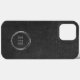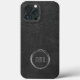 Un coque iPhone 13 avec un design minimaliste présentant un look en cuir noir arrière - plan accentué par des anneaux en argent pour votre monogramme qui embellit subtilement le coque, créant un look masculin élégant et moderne.