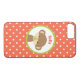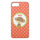Un étui téléphonique avec un mignon petit singe tenant une suce dans sa bouche à l'intérieur d'un cercle avec une bordure verte d'olivier. Le mot Bonjour au-dessus de sa tête, qui peut être customisé avec un nom ou un autre texte. L'arrière - plan est un motif à pois orange et blanc.