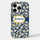 De petites marguerites blanches mignonnes aux centres jaune vif sur un arrière - plan bleu créent un coque iphone simple et doux. Personnalisez avec votre nom dans un ovale jaune bordé par un groupe bleu foncé.