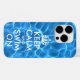 Personnalisable "Keep Calm and Swim On" avec texte blanc contre photo teintée d'eau bleue de la piscine. Le texte n'est pas défini comme un modèle, mais il est personnalisable. Vous pouvez ajouter du texte personnalisé pour créer votre propre coque de natation et de plongée en équipe.