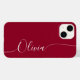 Burgundy Red White Elegant Calligraphy Script Personnalisé Nom iPhone 14 Smart Phone Boîtes dispose d'un design moderne et tendance simple et élégant avec votre nom personnalisé dans élégante calligraphie manuscrite typographie sur un arrière - plan rouge bordeaux. Conçu par ©Evco Studio www.zazzle.com/store/evcostudio