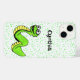 Ce coque iphone est blanc avec des pois vert vif et un serpent souriant de dessin animé qui est un vert vif avec le ventre jaune. Customisez votre nom ou votre texte avec le modèle.