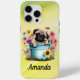 Un Joli iPhone En Marbre Jaune 15 Pro Max Conçu Avec Un Carlin Chiot Dans Un seau Avec Fleurs Vous Pouvez Personnaliser