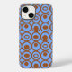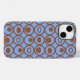 Ce boîtier téléphonique a un design géométrique de cercles en rangs avec des cercles ou ovales à l'intérieur en marron sur un champ de bleu.
