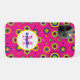 Cette couverture coque de cellule rose chaud a un motif coloré de cercles, de cercles et d'autres cercles en jaune vif, vert, bordeaux et marine. Customisez le cercle blanc et jaune avec votre nom, vos initiales, votre monogramme ou autre libellé. Faites le cercle et le nom aussi grand ou petit que vous le souhaitez, ou retirez-le complètement.