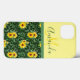 Ce coque iphone mignon a un arrière - plan jaune en haut avec votre nom monogrammé et votre initiale. Le fond est séparé par un ruban et est un champ de beaux tournesols en vert, jaune et marron.