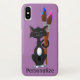 Un chat en tuxedo noir et blanc, assis avec un sourire joyeux au visage. Sa queue est courbée autour de deux pinceaux d'artiste, l'un avec de la peinture rose et l'autre avec du bleu. Ci-dessous est un modèle en texte noir pour ajouter votre nom pour personnaliser cette étui de téléphone amusant.