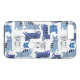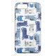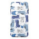 Un étui téléphonique avec un motif de chats de dessins animés dans différentes nuances de bleu et gris sur un arrière - plan blanc. Les chats sont stylisés et simplifiés, avec des détails minimes. Certains chats sont allongés, d'autres sont debout ou assis. Le motif est dense et couvre toute la surface du coque.
