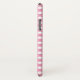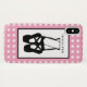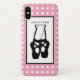 Boîtier de téléphone avec une illustration noire d'une danseuse de ballet pantoufles et ses jambes inférieures qui sont transparents permettant la couleur de l'arrière - plan de montrer à travers. Ballerina se tient sur ses orteils, en pointe. Arrière - plan est un motif en pois blanc sur rose.