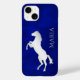 Ce coque unique présente une belle silhouette argentée brillante élevant l'image d'un cheval contre un arrière - plan bleu royal dégradé. Ajoutez votre nom en argent assorti sur la droite, et vous avez un coque élégant, en particulier pour quiconque aime les chevaux.