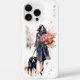 Femme chic et élégante avec bouquet floral. Elle est en train de promener son chien à travers la ville. Ce boîtier téléphonique est personnalisable avec un nom en haut à droite dans une police sans serif gris foncé.