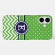 Le design coque mignon et girly présente un mélange de motifs preppy avec de minuscules pois douces sur le dessus et un motif en zigzag chevron en dessous, séparés par un ruban strié de rugby coordonné et personnalisés avec votre nom monogramme ou initial. Si adorable ! Cliquez sur Customiser pour modifier les polices de texte et les couleurs et créer votre propre design unique.