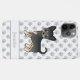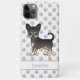 Illustration originale de Destei d'un chien de race Chihuahua vêtu de noir et de tan lisse. Il y a aussi une zone de texte personnalisable pour un nom. L'arrière - plan a un motif d'empreintes de pattes de chien gris.