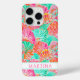 Customize this colorful coral and turquoise watercolor shell iPhone 15 pro case with your your name in a trendy modern CAP font in pink on white. It's so modern and trendy!