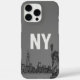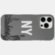 coque iphone avec un graphisme "NY" centré et réduit, un arrière - plan dynamique et une ligne d'horizon d'art noir avec Statue de la Liberté.