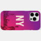 coque iphone avec un graphisme "NY" centré et réduit, un arrière - plan à dégradé rose-violet plein de vie, et une ligne d'horizon d'art noir avec Statue de la Liberté.