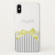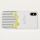 Un motif à rayures grises et blanches ceinturées à peine Il iPhone X Coque agrémenté d'une image d'un joli arc en satin jaune clair. Personnalisez en ajoutant le nom de votre fille préférée. Image imprimée plate, NON apposée avec un ruban réel.