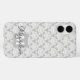 Ce joli coque iphone présente un design féminin avec un motif damassé blanc dentelé sur un arrière - plan gris clair. Il y a une initiale monogrammée ainsi qu'un nom personnalisé.