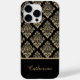 Damask Black Gold Swirl Nom personnalisé Coque-Mate iPhone 14 Pro Max Coque Ce design présente un élégant motif damassé or sur un arrière - plan noir avec un nom personnalisé. Personnalisez en ajoutant votre nom en modifiant le texte de la zone de texte ou en supprimant sans nom. Conçu pour vous par Evco Studio www.zazzle.com/store/evcostudio