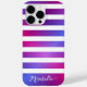 Créez un étui téléphonique personnalisé unique avec un arrière - plan rose, violet et bleu foncé et un motif rayé blanc. Le modèle texte facilite la saisie de votre nom.
