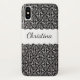 Ce boîtier de téléphone iPhone X a un élégant motif damassé noir et blanc élégant avec des rouleaux blancs fantaisie. Customisez votre nom dans la bordure blanche ondulée avec le modèle.