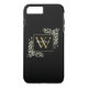 Elégante aquarelle verdure feuille monogramme de nom étui de téléphone avec un monogramme d'or initial sur un arrière - plan noir chic. Conçu par Thisisnotme©