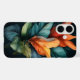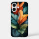 Des fleurs audacieuses, stylisées d'orange et de jaune aux accents verts profonds sur un arrière - plan foncé évoquent un paradis tropical enflammé par les teintes du coucher du soleil.
