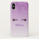 Phonecase avec un design élégant et tendance. L'arrière - plan est un dégradé violet avec une image de parties scintillant faux scintillant qui descend du haut. Une paire de cils mignons ceinturés sous l'image de la parties scintillant.