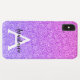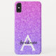 La parties scintillant violette à l'ombre de Girly et de glam scintille le nom monogramme et le coque iphone initial. Personnalisez avec votre nom personnalisé en noir et votre monogramme initial en blanc. Vous pouvez modifier la couleur du texte, le style et la taille de police à l'aide de l'option personnaliser.