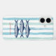 Cet élégant coque iphone esthétique à thème côtier dispose de 3 sardines de style vintage dessinées à la main sur un arrière - plan de bandes bleu aqua et turquoises pour ajouter une ambiance nautique préppie.