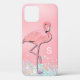 Coque iphone rose avec des graphiques d'un joli flamant rose et une fausse parties scintillant colorée, le long du fond. Personnalisez le monogramme d'une lettre blanche pour répondre à vos besoins.