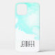Un étui téléphonique avec une bordure abstraite le long du dessus avec des couleurs tourbillonnant vertes et bleues. Un design doux et estival. Une lumière croise la texture derrière l'image.