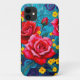 Les roses rouges vives sont entourées de cartouches vertébrales et de petites fleurs jaunes, créant ainsi une composition vivante et colorée. Les vertèbres bleues et violacées compliquées en arrière-plan complètent les fleurs et ajoutent une touche dynamique et capricieuse.