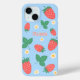 Un étui téléphonique doux qui dispose d'un motif délicieux et ludique de mini fraises éparpillées sur arrière - plan bleu. Les fraises sont rendues dans un rouge vif avec des feuilles verts, et elles sont entrecoupées de petites fleurs de fraises blanches ou jaunes clairs, ce qui ajoute au charme. L'ensemble est gai, frais et sucré, idéal pour les enfants ou les adolescents.