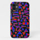 Un design original composé principalement de formes colorées, principalement des triangles, mais aussi de quelques rectangles et cercles en rouge et bleu bordés de blanc.