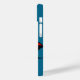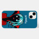 Coque iphone personnalisé mignon goth avec l'illustration numérique d'un drôle de personnage mort-vivant à la peau foncée avec les yeux brillants, les cheveux bleus, les ventilateurs et la cape rouge vibrante sur arrière - plan bleu foncé. Design amusant pour Halloween.