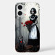 +AI ART+ Robot gothique fille avec des fleurs rouges et son chaton branché debout dans une forêt. Es-tu son véritable amour ? Elle t'attend.