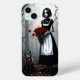 +AI ART+ Robot gothique fille avec des fleurs rouges et son chaton branché debout dans une forêt. Es-tu son véritable amour ? Elle t'attend.
