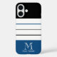 Ce boîtier de téléphone moderne est doté d'un motif rayé coloré en noir, bleu océan, gris et blanc. Personnalisez-le avec votre nom et monogramme en caractères blancs placés en bas. Cliquez sur Customiser plus loin pour modifier les couleurs.