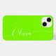 Green White Elegant Calligraphy Script personnalisé Nom personnalisé iPhone 14 Smart Phone Boîtes dispose d'un design moderne et tendance simple et élégant avec votre nom personnalisé dans élégante calligraphie manuscrite typographie de script sur un arrière - plan vert. Conçu par ©Evco Studio www.zazzle.com/store/evcostudio