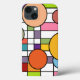 Ce boîtier téléphonique a un design moderne du milieu du siècle d'une grille avec quelques rectangles colorés et des cercles sur le dessus dans des couleurs rétro.