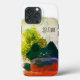 illustration de chat moelleux bleu et noir caché derrière un paysage de blocs et de grungy avec un arbre.un cadeau coque iphone spécial pour ceux qui sont amoureux de les chats.