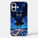 Belle cabine téléphonique inspirée de dessins animés avec un hibou volant sur des toits enneigés la nuit sous un ciel étoilé. Parfait pour les conceptions hivernales mystiques et sereines.